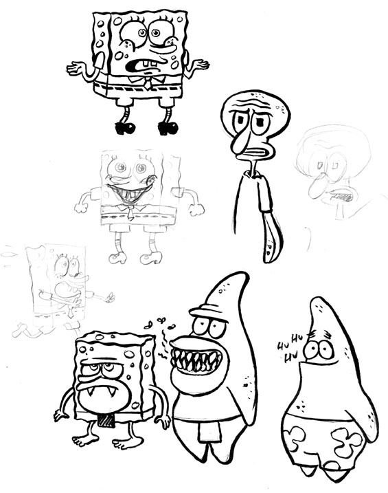 Hier soir, je me suis maté mon dvd de Bob l’Eponge (ben oui, puisque j’arrivais pas à lire Harry Potter). Et comme j’adore dessiner en regardant la télé, ca a donné ca :