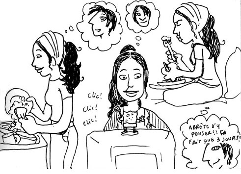 On est ensemble depuis peu de temps, et je ne dois pas m’enflammer. Parce que si ca fait Patatras, notre relation, alors je vais morfler. Je ne me permettrait pas d’ecrire cette note publique si je ne savais pas que de son coté c’est a peu de choses près les mêmes sentiments, les mêmes craintes ou questions… Non je ne vous dirai pas qui c’est, il vous le dira peut-être lui-même, s’il a envie (pis c’est pas avec mes pov portraits pas ressemblants du dessin précédent qu’il est reconnaissable !).