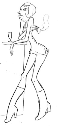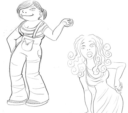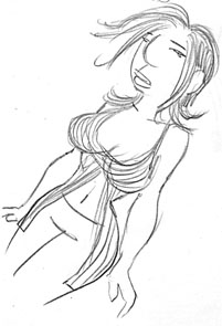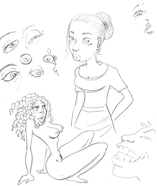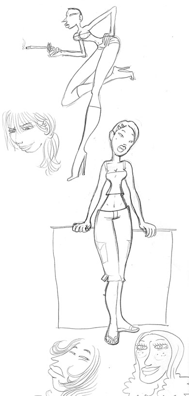 C’est ce qui m’arrive quand je me met au lit, télé allumée, et que je laisse aller distraitement le crayon sur la feuille. Je fais des meufs. Des tas de meufs. Du dessin-plaisir d’ado, de quand on-sait-pas-encore-dessiner-les-garcons. Voilà la dernière fournée.