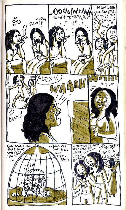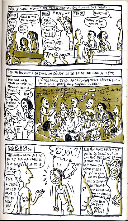 Je me suis dit que ca amuserait peut-être les lecteurs de mon blog de lire quelques vieilles bd tirées de mes carnets de vacances… Mon style a bien changé depuis, je ne me dessine plus en « mérou ». Toujours le meme principe, ces bédés ont été dessinées très vite au stylo a deux balles dans un touptit carnet format livre de poche, ce qui ne facilite pas l’aspect « joli ».. mais on s’en balance. C’est juste un prétexte pour raconter toutes mes ptites anecdotes de vie.