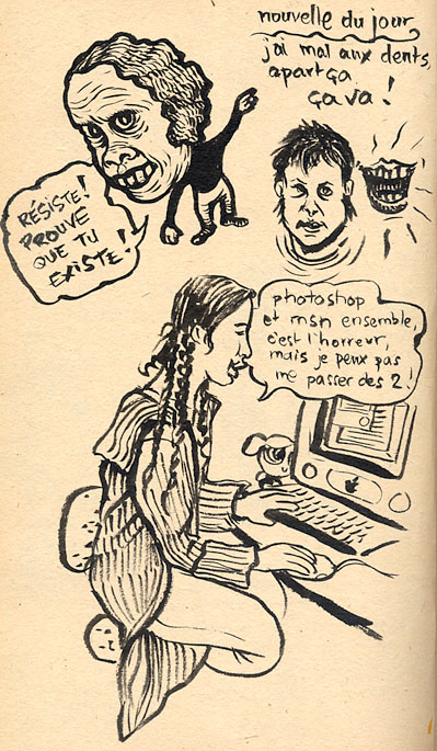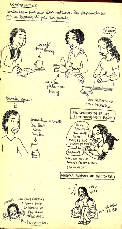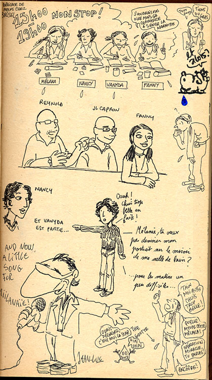 La dédicace s’est trrrès bien passée : on a eu du monde en permanence, on a beaucoup discuté/plaisanté avec les gens, l’ambiance était vraiment très chouette, détendue, et on a pas levé le nez de nos dessins. Pis on a été accueillies comme des reines, les gens de Brüsel sont adorables. J’ai vu le Benoit Houbart et rencontré des tas de gens qui connaissaient déjà ma vie par le blog. C’est assez curieux, de parler avec des inconnus qui savent plein de choses sur ma vie quotidienne…