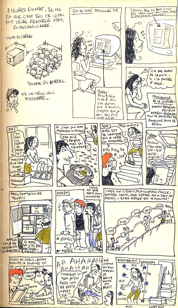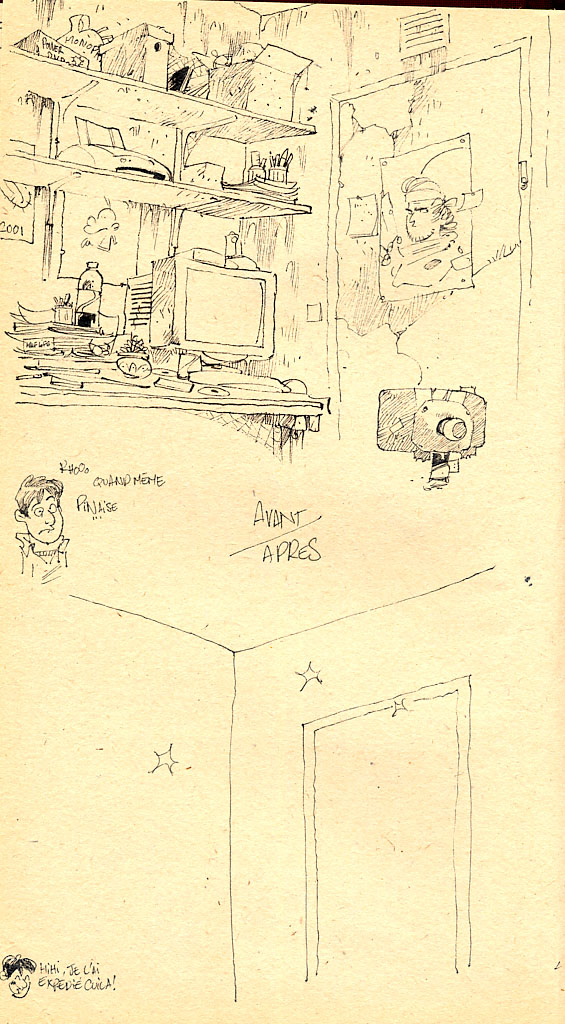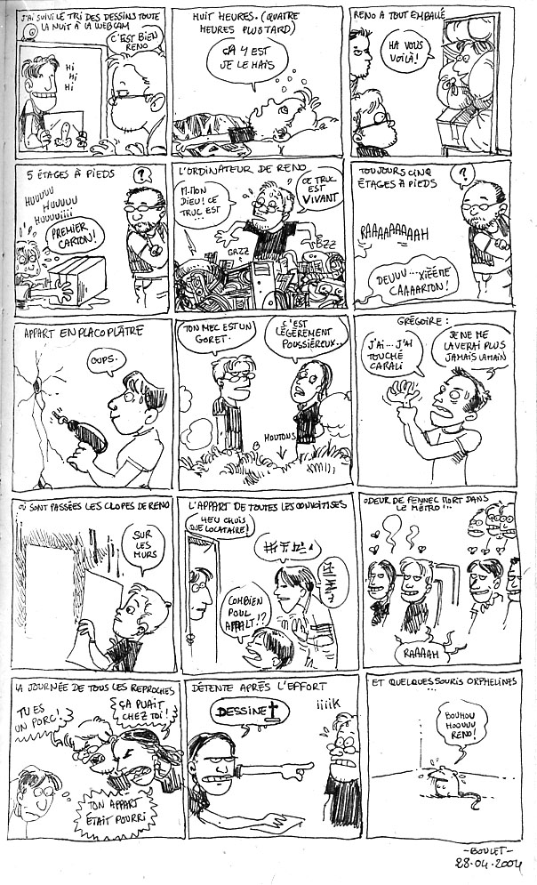 Mercredi matin, c’était le déménagement des gros trucs. Mon père et moi, on est allés en kangoo jusqu’à chez Reno, retrouver ce dernier ainsi que Boulet et son frangin Grégoire…