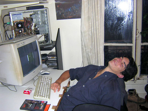 et j’en profite pour mettre cette photo qui me fait beaucoup rire aussi : le jour de l’anniversaire de Reno, à une heure avancée de la nuit. Il s’endormait un peu dans les vapeurs éthyliques et la joie d’installer son cadeau, half life 2. Regardez comme il a l’air heureux !