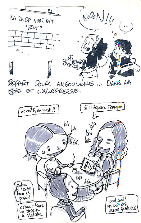 On arrive à montparnasse, et là, paf, on se rends compte que tous les trains de la journée ont été annulés. Tous ? non, car 4h plus tard, un irréductible TGV, bourré à craquer de bédéeux, se dirige vers la charente convoitée…