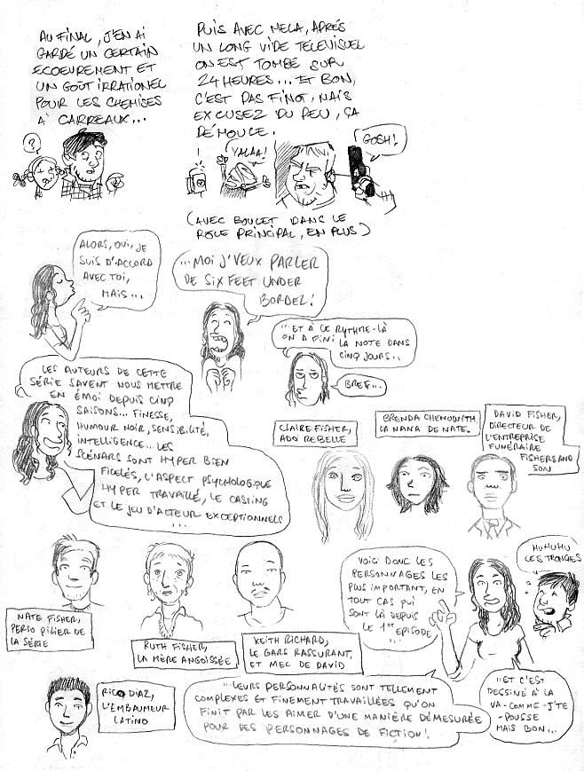 Bon, j’écris dans les archives alors je ne sais pas si Melaka va me lire, mais cette note sur 6feet under m’a remué la mémoire. En fait j’ai 18ans , et j’ai commencé à regarder la serie sur canal jimmy dès son lancement, j’avais donc environs 11ans. c’était vraiment notre série familiale, on l’a vraiment adoré, surtout que chaque personnage correspondait exactement à un membre de ma famille (sauf le pere): ruth aussi inquiète et "chiante" que ma mère, nate aussi j’m’en foutiste (au debut surtout) que mon frere (le plus vieux), david aussi serieux et coince que mon autre frere (qui a aussi du mal a reveler son homosexualite!!) et claire, aussi paumee que ma soeur, et qui reproche a sa famille de ne pas avoir de souvenir pcq trop jeune, comme moi. Bon, mes commentaires concernent surtout la premiere saison, mais je les ai toutes regardees avec bcp de plaisir, et d emotion, surtout les derniers episodes ou j ai pleuré sans cesse (naaaaaaaaaaaate reviens!!). Et j’ai tellement pleuré qd la serie s est arretee pcq jme suis rendue compte que j avais grandi avec, que jetais familiere avec ces personnages, et que je ne les verrai plus… j ai vraiment eu l impression de perdre un membre de famille!!!