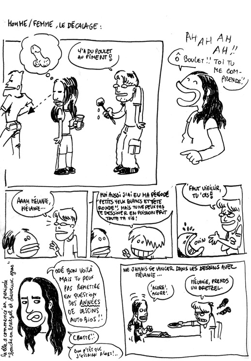 Donc pour notre premier petit cours d’histoire mélakarnien, voici une page décisive sur plusieurs point : réalisée il y a quelques années (3 ? 4 ?) c’est la toute première intervention de Boulet (que je venais de rencontrer) dans mes carnets (l’a évolué hein ?). De plus, c’est LA page qui a signé l’arrêt de mon ancienne manière de me représenter en tête de mérou. À ce moment-là , je suis célibataire (pas de trahison frululutienne, je vous rassure) et y a même un petit commentaire assassin de Capu d’amur alias miss langue de pute (si si, c’était assumé). Voilà voilà ..