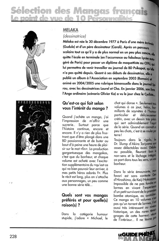 Éééh sinon, j’ai l’immense fierté de vous présenter le Guide Phénix des Mangas paru (ou à paraître très prochainement) chez Asuka : on m’a choisie parmi 10 personnalités de la bd pour donner mon avis sur les mangas !! Et non des moindres, les personnalités : Julien Bastide, Jean-Pierre Dionnet, Patrick Gaumer, Jodorowsky, Jacques Lalloz, Rodolphe Massé et Joann Sfar !