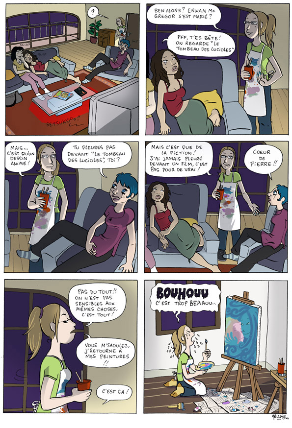 PS par contre je n’ai pas tilté moi sur la page des roomies, ça représente quoi la peinture? n’ayant pas vu le tombeau des lucioles es ce qu’il y a une réf que je loupe? ou elle pleure juste parcequ’elle a déssiné un truc trés beau? (oui bon dsl je suis fan du studio ghibli etc mais celui la je n’ai jamais eu l’occasion 🙂 )