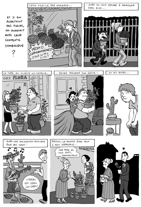 sympa, marrant! L’idée est trés originale. Graphiquement c’est trés jouli et puis j’aime bien le ryhtme de l’histoire qui s’accélère jusqu’à la fin où d’un coup tu brise le rythme avec ta phrase finale.