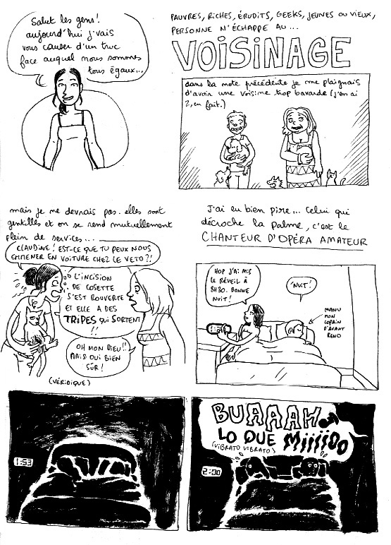 Huuum tu me donnes envie de faire une note sur ma super voisine du dessous! Toujours vissée derrière son judas à attendre notre passage pour nous sauter à la gorge… Et à gueuler dès que les chats font un pas… gnrmbl!!! è__é