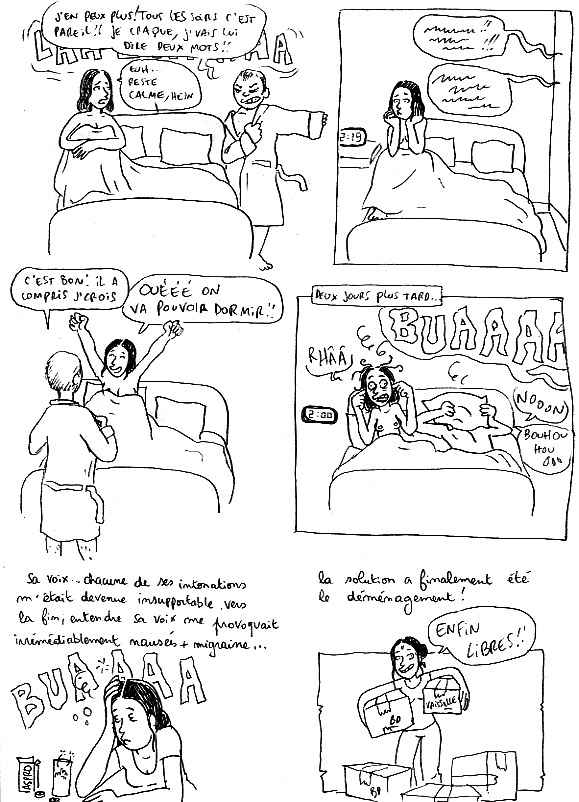 En tout cas, ça fait plaisir de voir qu’on est pas seul à connaitre ce genre d’ennuis qui rend malade (j’ai pas encore la nausée et la migraine, mais j’ai la tension qui monte dès que j’entend un murmure de télé ou de conversation la nuit, maintenant)…