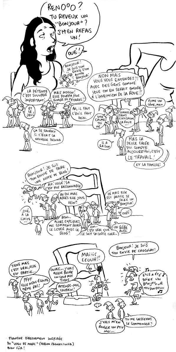ah très bon, très bon ça! Je ne connaissais point la bd "le voeu de marc" et tu as en plus de m’avoir fait rire tu as eveillé ma curiosité là dessus.Bon sur ce, y’a "j’ai envie de me faire une omelette" qui m’appel. Je vais donc me faire un oeuf.