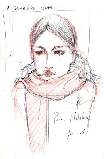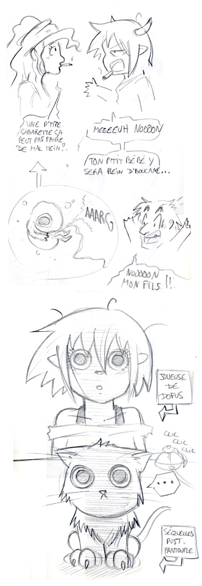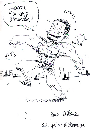 *reviens pour un post-scriptum* Au fait j’avais pas mis les noms des bloggeurs qui m’ont fait des gribouilles mais bon, je me rends compte qu’il faut en fait, alors on a dans l’ordre : John, Aude Picault – Claude, Ella, re-Aude, Maliki, Ak et Din.. J’en ai pas eu des tas parce que bon, après une journée de dédicaces j’avais pas trop envie de les faire tous rebosser, mais je vous aime plein, les copaings, et même ceusses qui m’ont pas fait de dessins aussi ! Et aussi ceusses que j’ai même pas pu rencontrer alors que j’avais vachement envie ! des bisous pleins de miasmes !