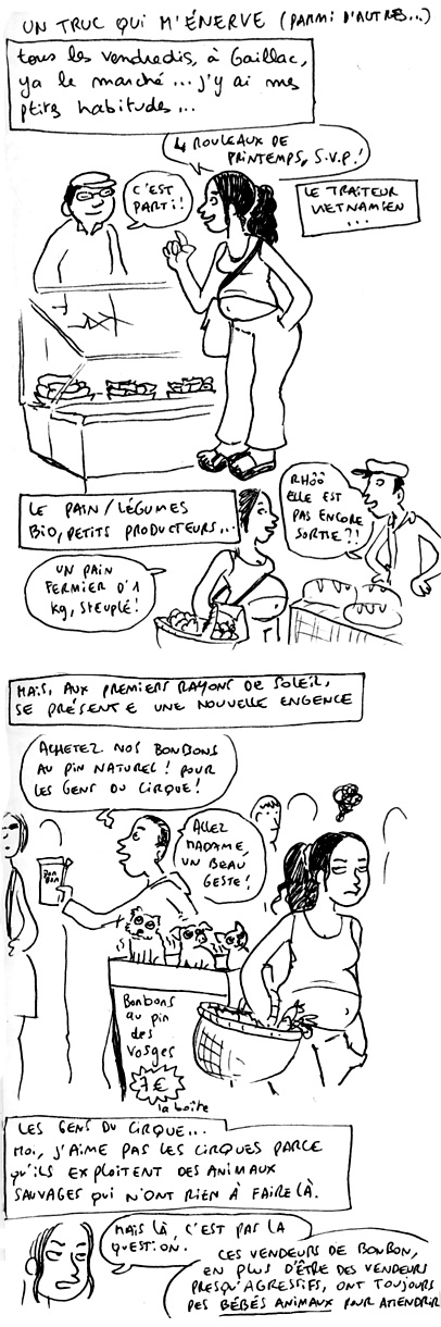 Sauf que y’a pas de cirque, c’est une arnaque, et nous, pauvres femmes, on tombe dans le panneau parce que les bébés chèvres et cochons noirs ils sont cromeugnons… (commencez à leur poser des questions, les réponses sont évasives, et ils se contredisent d’une semaine à l’autre)