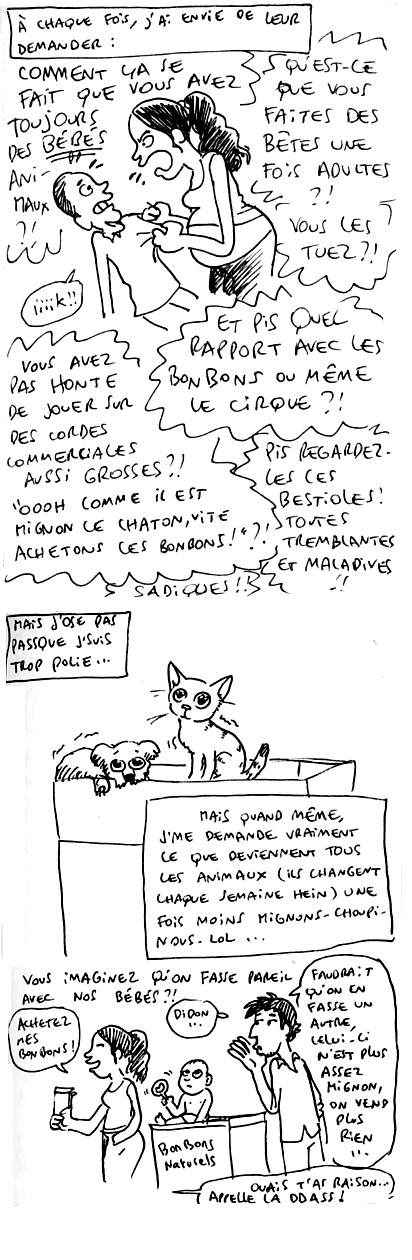 Mais les petits animaux ne sont pas mis là en évidence pour etre adopté ? c’est possible que le gars qui vend les bonbons a l’arnaque vosgienne essaye aussi de se débarrasser des bébés en trop dans les portées nombreuses des animaux de companies du cirque …
