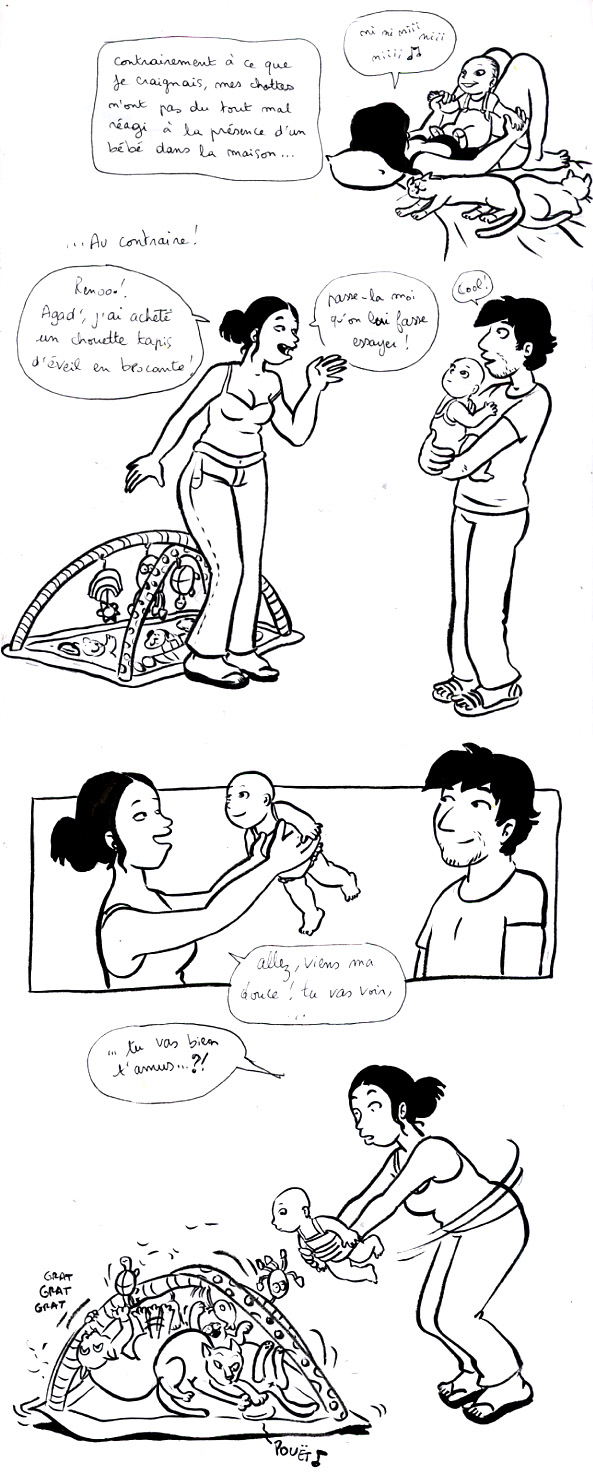 C’est vraiment chouette de voir un couple qui n’a pas abandonné ses chats à cause du bébé (pas comme tant d’autres…) et qui montre que la cohabitation se passe super bien ! ^^