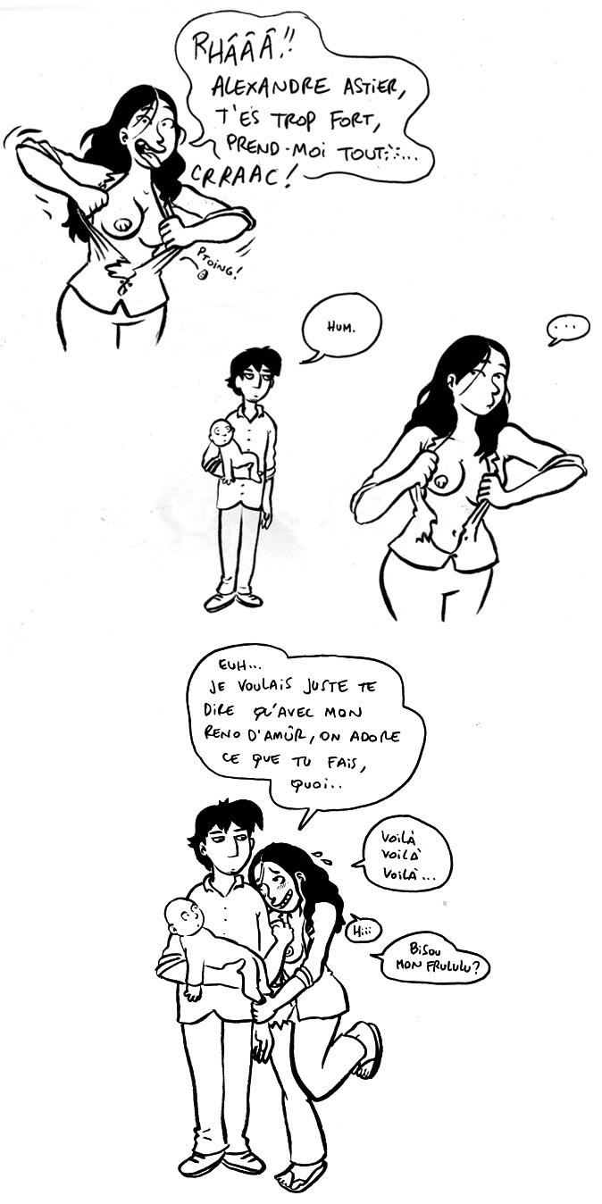en BD : Ben, à part mon Reno d’amur-que-j’ai-deja-dans-mon-lit, je ne peux rien dire, c’est un coup à se retrouver super mal à l’aise en festival ça uhuhu (non mon frululu je, je déconne voyons, tu sais bien que je n’ai aucun secret pour toi mais mais que fais tu avec notre enfant noooon pas par la fenêtre !!)