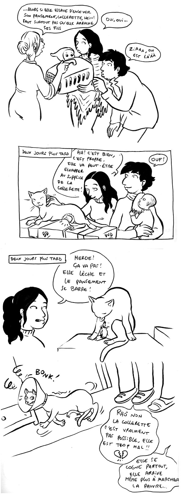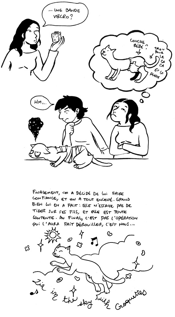 J’passe réguliérement ici; mais là, j’ai vécu la meme chose avec mon chat alors c’est génial de voir comment tu as narré cela ^3^ (moi je suis bien trop amatrice pour me permettre de raconter des choses comme en BD ^^) Chapeau! … Et ca me rassure de voir qu’il n’est pas la seul a avoir subit l’épreuve de tissu qui fini par se repler sur les points de soutures huhu! C’est sur que ca ne peut qu’etre vecu 😀 J’adore!