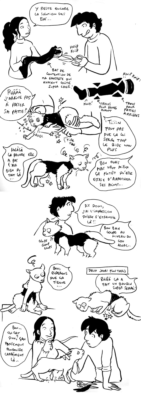 C’est toujours triste a mourir les chats a collerette qui se cognent a toutes les portes et les chaises, … mais j’avoue qu’il y avait de l’idee avec la solution des bas!