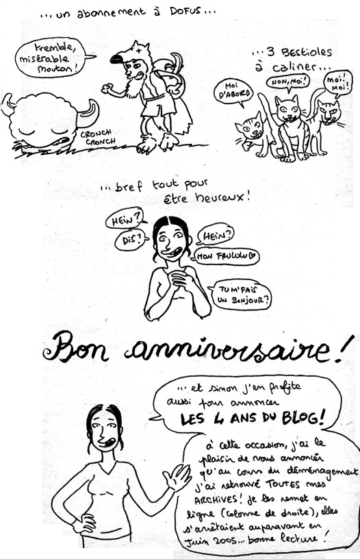 Bon anniv à tout les deux, mais dit moi… c’est le combien précisément l’anniv de ton blog ?