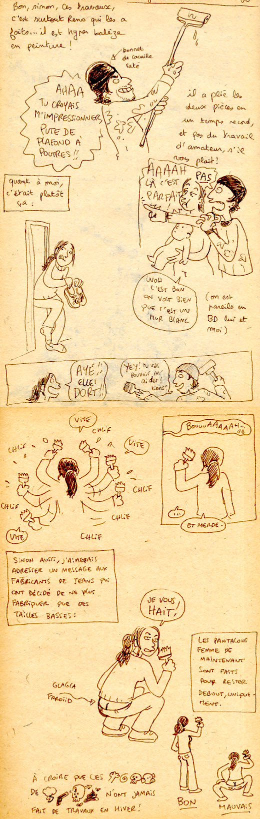 Ayant un cul inadapté à la taille basse, j’ai pas mal galéré avant de trouver le jean acheté en trois exemplaires du coup : chez Camaieu, une taille ni basse (pas de raie/culotte/string qui dépasse quand tu t’asseois ni de bouée intempestive même sans ceinture) ni trop haute (pas d’effet "au secours j’étouffe" après manger), pour 30€ je trouve ça chouette (y’a un camaieu à Puicy.. Puycl… Pucy.. chez vous, là ?)
