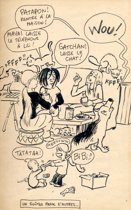 J’explique à la place de Mélaka, parce que bon, faut s’y retrouver, dans ce bordel ! A droite de Méla, c’est Barbara, sa nièce, la mère de Lili et la maîtresse de Patapon. En face, c’est Ingrid et sa chienne Gatchan. En revanche, je ne vois pas trace de Philémon, le chien de Barbara. Oukéti ? (Peut-être qu’en tournant l’image dans tous les sens, on peut le trouver caché dans un coin ?)