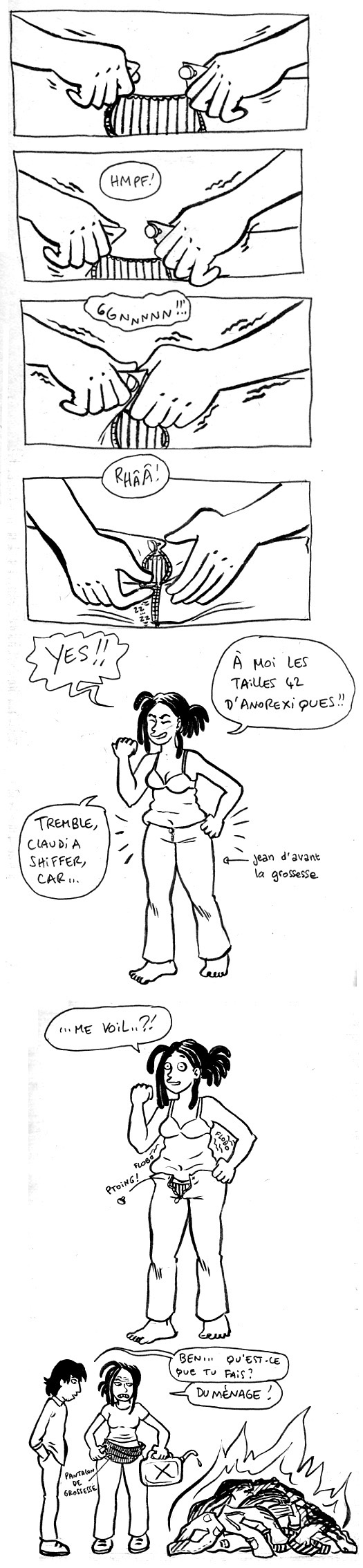 Moi j’ai pas de gamins mais je fais des etudes pourries j’essaie d’arreter de fumer et je supporte pas la pilule que pourtant je continue a prendre(ma vie est génial hein) et avant j’etais tres fine et je suis passé assez brusquement du 36 au 40 sans prendre une once de gras en haut mais tout au bide hanche cuisse. Avant je m’en foutais, et quand je vois toutes ces nenettes super seches dans leur taille 34 jean ultra slim, je badddddddddd.