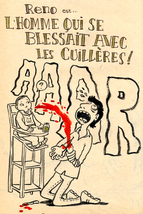 Houla! Ça n’a pas l’air dangereux, pourtant, au premier abord, les cuillères… Reno s’est il remis de ses émotions? Plus sérieusement, qu’est ce qui s’est passé avec cet ustensile?
