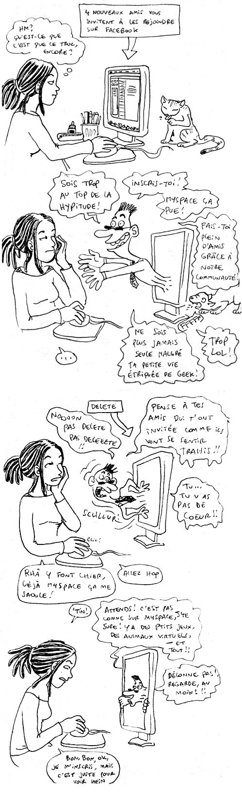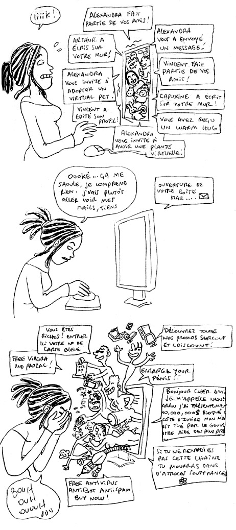 J’aime beaucoup la personnification des spams ! Sinon, je suis comme Ozwel… Facebook m’est bien utile pour garder contact avec des amis qui sont sur un autre continent.