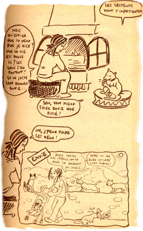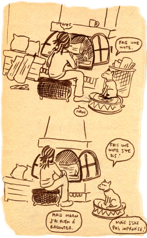 Tu peux faire une note aussi sur le fait que tu fasses du feu alors qu’on est presque en mai, hein. Y’a plus d’saison, ma pôv’tite dame ! ^^’