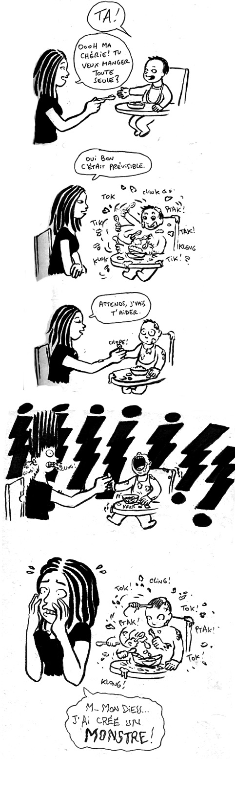 OUlà! brave petiiiiiite…. Courage, dans ma famille les bébés se font servir à table jusqu’à leurs six ans. J’espère que tu tiendras jusque là…. Conseil: mets des gants pour amortir les coups de cuillère accidentels^^