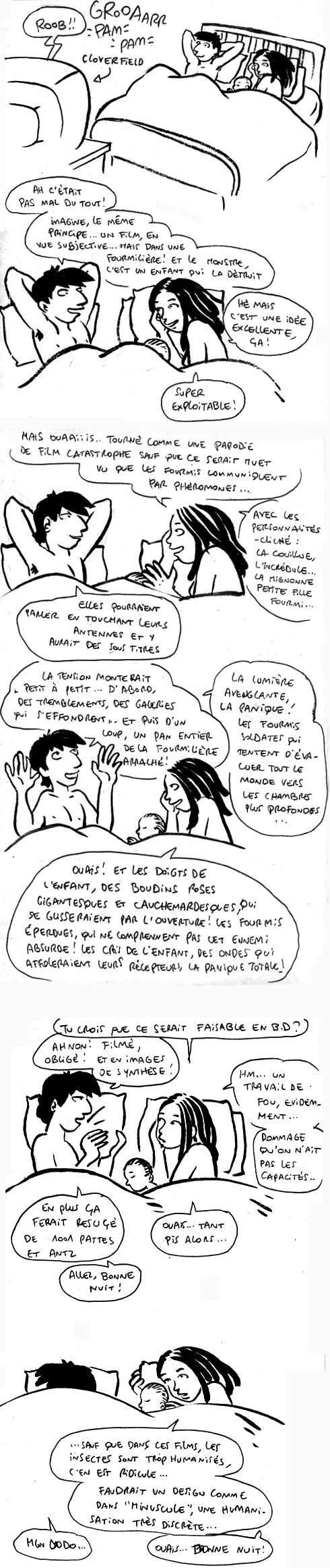 Tyr > j’aime bien Werber mais là j’ai du mal à le croire quand même.. l’idée de la fourmilière ne me semble pas non plus d’une originalité à toute épreuve, la preuve, on y a pensé 😀 enfin, forcément, y en a d’autres qui ont eu l’idée de se plonger dans ce monde de l’intérieur sans avoir forcément lu ses bouquins, y a qu’à voir comment tous les gamins (et pas que) scotchent devant les fourmilières qui parsèment notre planète de tous temps..