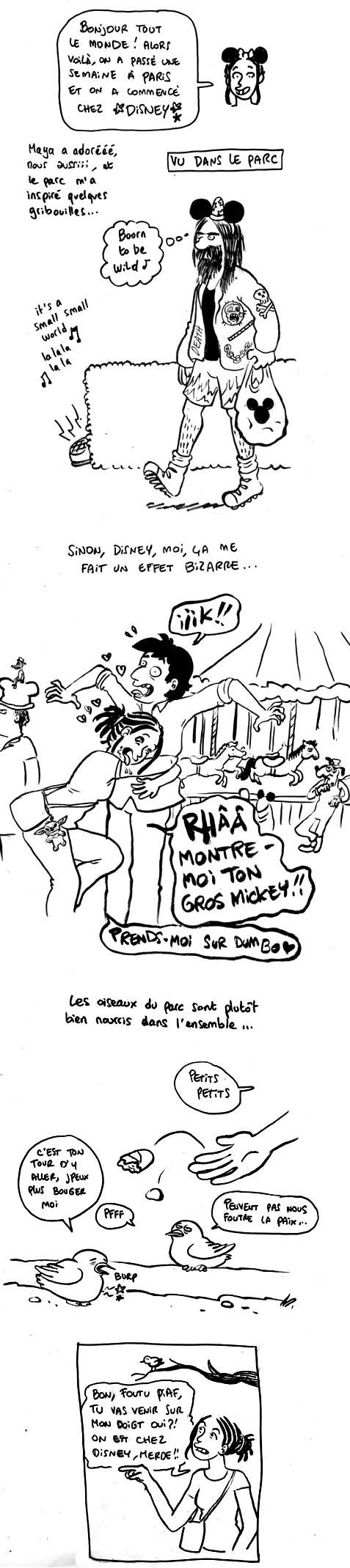 Aaah ! disney ! ces atractions qui remuent le dedans, ces boutiques pleines de choses qu’on a pas besoin mais qu’on ramène quand même, ces pauvres saisonniers qui crévent de chaud sous les déguisement de nos héros…