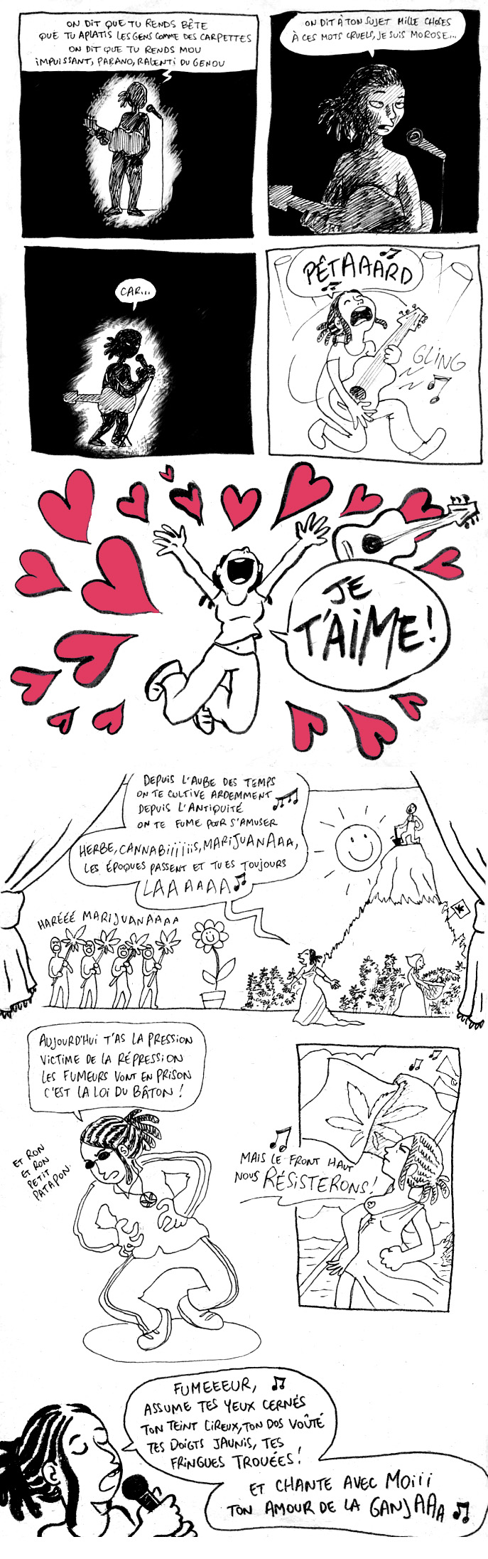 Je pense que la plupart des personnes ici verront que c’est un DÉLIRE, sous forme de chanson, et que non en vrai je n’ai pas roulé un pétard dans la pièce ou est ma fille pour ensuite danser avec elle, autant que je n’ai jamais chanté d’opéra sur une scène avec des champs de cannabis derrière moi, ni même tenu une guitare dans mes mains dans la vraie vie ! Je me contente de parler de mon plaisir coupable, tout le reste n’est que fiction et mise en scène. Je ne révèle à personne ma gestion du truc, mais vous vous imaginez bien que je suis assez adulte pour ne pas faire des souflettes à mon bébé ou me reveiller avec des bangs hein T_T