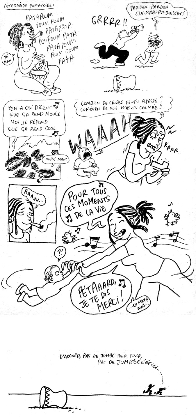 Huhuhu, c’est super bien fait ca comme planche ! Tu vas pas tarder a t’en prendre plein la tronche dans les comm je pense, car O ignominie tu oses fumer de la drogue a cote de ton enfant… Moi je trouve ca super zen, j’aurais aime avoir une maman cool comme ca !!