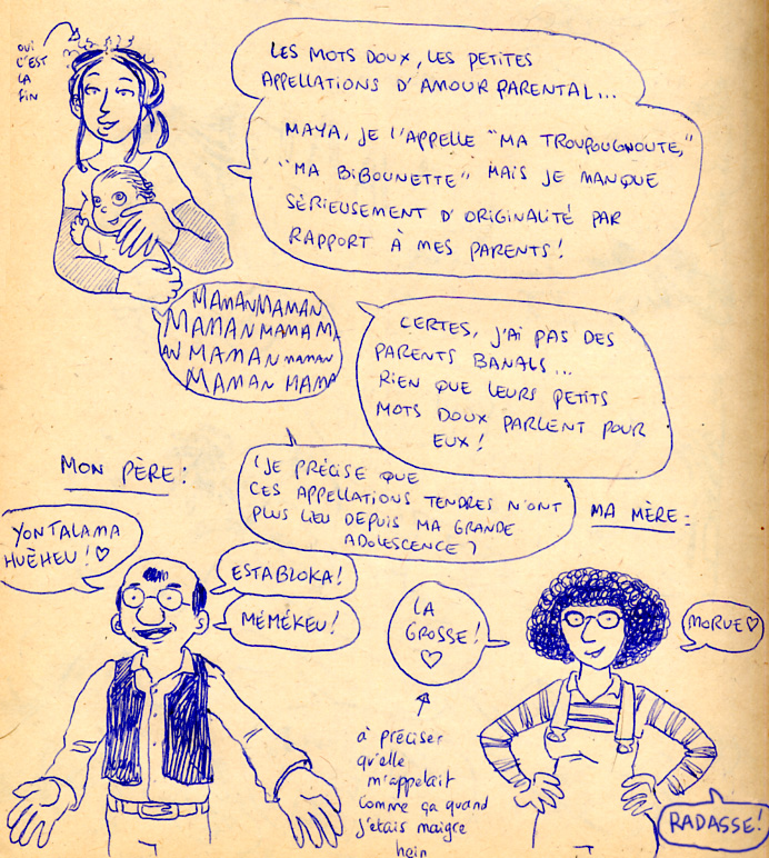 "Mon chat", "mon petit chat", "ma puce", "pupuce", "mon chatounet" pour ma mère et "boulette" "doulette" "grounette" "mimine" pour mon père; les deux m’appellent comme ça encore maintenant. Parfois j’aime bien, parfois c’est un peu la honte et dès fois j’ai juste envie de leur rappeler mon prénom en hurlant "putain de merde!" à la fin mais je ne le fais pas : ils m’aaiiiiiiiiment et surtout je ne suis pas mieux.