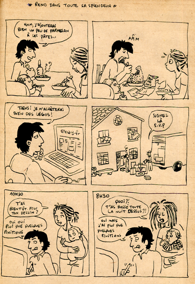 Huhuhu, moi, c’est l’inverse: quand je fai un dessin, je m’arrête toujours aux trois-quarts en disant "Wouah, c’est bon, j’vais pas faire les détails, tout le monde a bien compris de quoi je parle!"… Mais je bave quand même sur les dessins de Reno du coup!