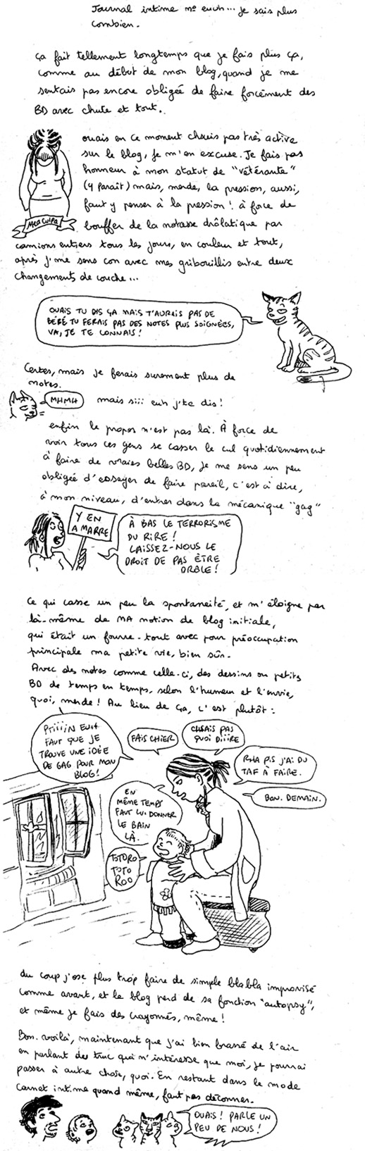Pis c’est pas mal les pages en mode "journal intime", ça ne nécessite pas forcément de dessins pour faire passer le message. Si tu préfères ça, alors fais-toi plaisir!