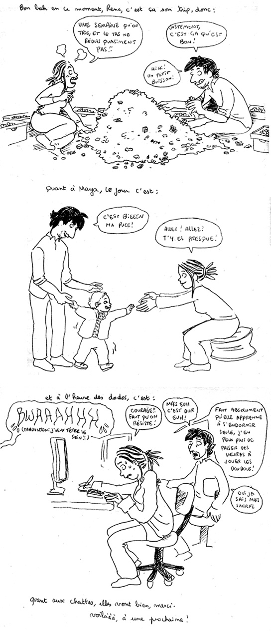 Je parle que pour moi, mais je m’en moque que tu sois drôle tout le temps ou pas ! Bon, une fois de temps en temps, ça fait du bien de rire un coup, c’est sûr. Mais en dehors de ça, ce qui me fait plaisir, c’est de voir de temps en temps de jolis dessins, de suivre un peu votre vie de famille à tous les trois, même si ça a un côté "voyeur", ça fait plaisir de voir les choses avancer.