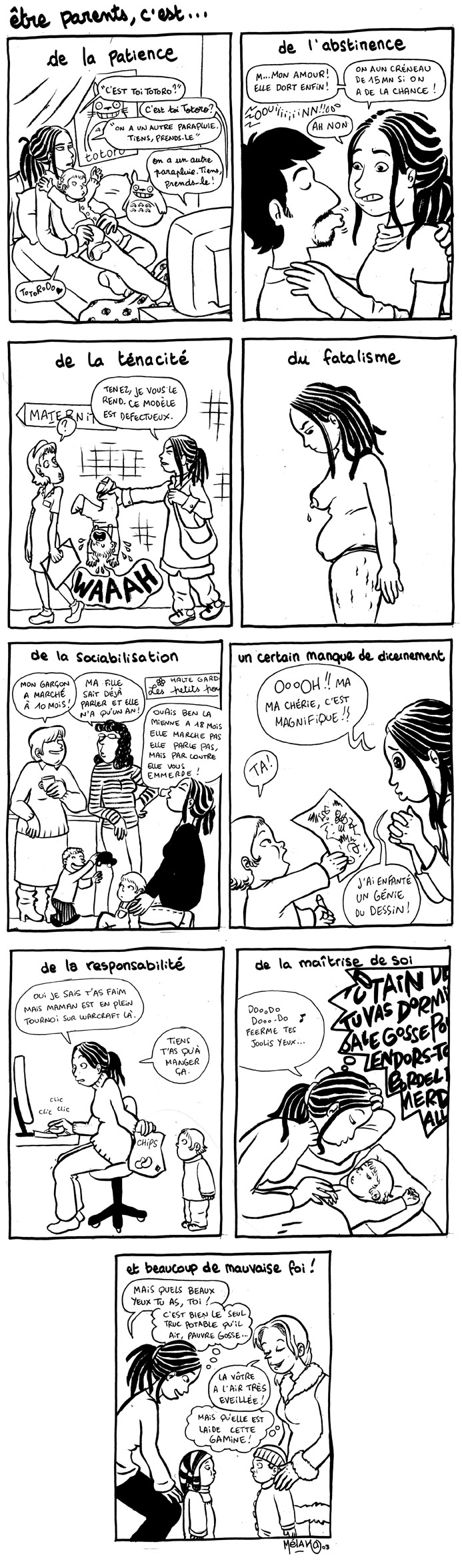 Voici la bd qui passe dans le prochain psiko, dont le thème est « jeunes parents ». Je ne suis pas très fière, ça fait « blog » c’est certain, mais pour le Psiko, ça n’est finalement pas trop adapté.. Je crois que je vais dorénavant me contenter d’y publier mes histoires avec Davy et c’est tout…