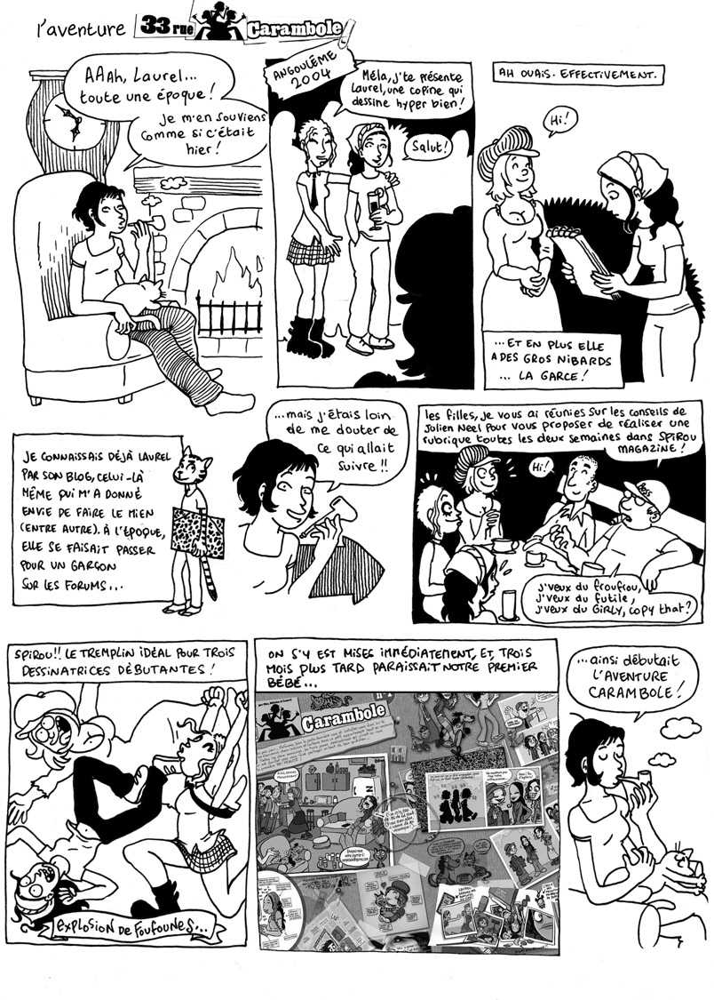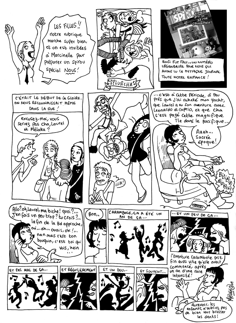 Awwww, Carambole, que de souvenirs. C’est par là que je vous ai connu toutes les trois. J’ai d’ailleurs encore tous les Spirou de cette époque, c’était la rubrique que je lisais en premier quand le magazine arrivait! 🙂 C’est là aussi que j’ai vu pour la première fois Neel, Boulet et Libon, même si j’ignorais complètement que c’était (les vacances avec Boulet… quelle histoire!). Je pensais même que vous habitiez ensemble pour de vrai, c’était l’âge où j’avais pas accès à Google, alors j’étais un délicieux ignorant! ^^
