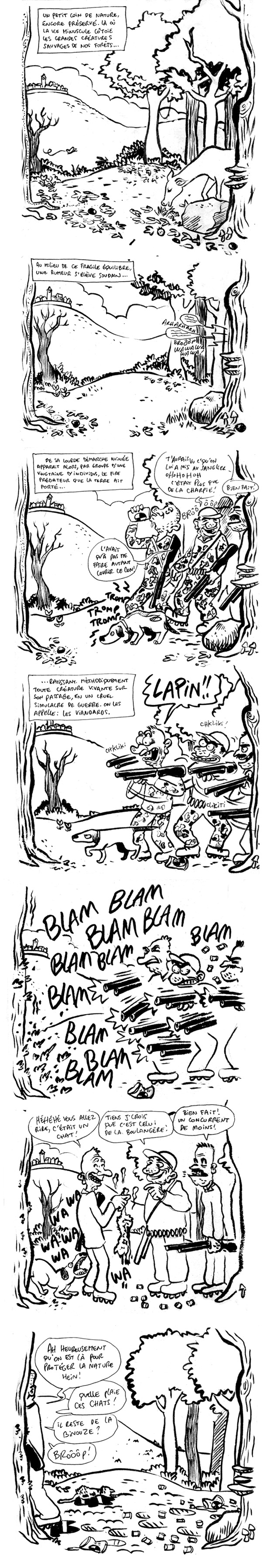 évidement que ce strip est caricatural, je vois pas comment j’aurai pu me défouler en faisant un strip tiede et modéré. Pis les gars, avant de vous emporter, apprenez à comprendre ce que vous lisez (je fais référence à mes commentaires). Juste une précision, dans mon village, 50% des gens du crû ne supportent pas la chasse. Je connais des chasseurs modérés, qui eux-même haïssent ces « viandards » que je caricature et ne les supportent pas non plus.