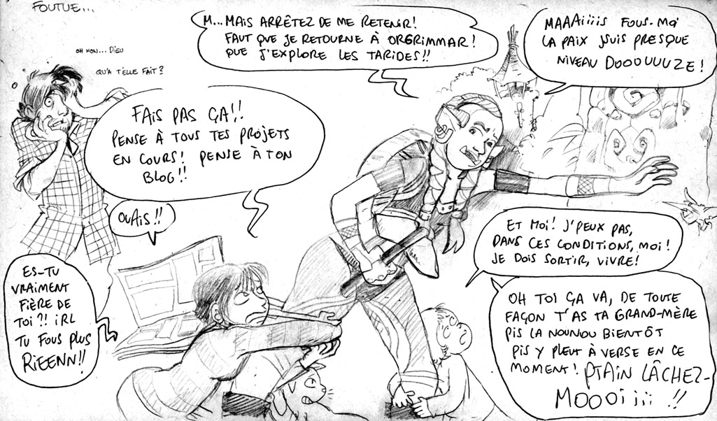 Je ne vous félicite pas. Maintenant, comment expliquer à Madameeee… que "Non, on ne peut pas continuer de jouer à Wow, nous avons une fille de 22 mois, nous avons une vie sociale, etc… Nous devons donc supprimer notre abonnement et reprendre une vie normale." On espérait que vous trouviez une solution miracle (cf. post du 11/09) et que vous nous aideriez à trouver un jeu moins addictif. Nous voilà fait comme des murlocks ! Argh…