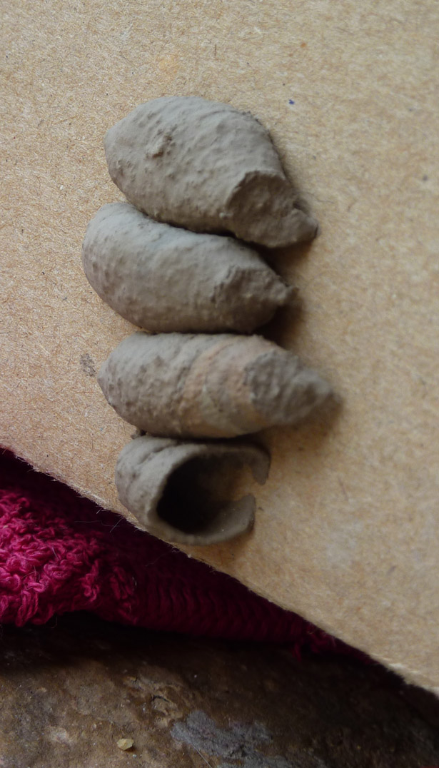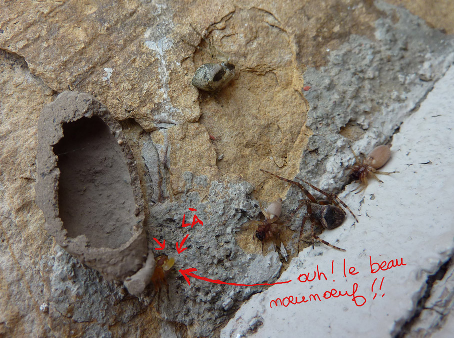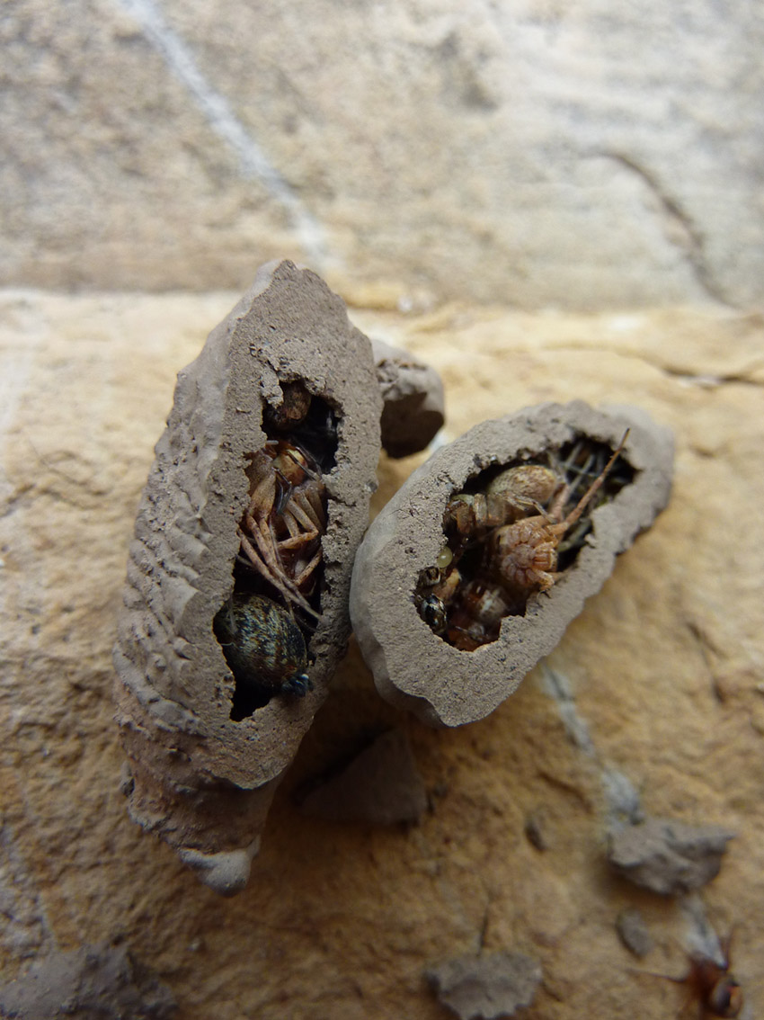 Un petit coup d’oeil rapide sur google, et voilà t-y pas qu’on apprend que ces araignées ne sont pas mortes, justes paralysées, enfermées dans ce cocon de terre et de sciure.. La guêpe pond son oeuf sur l’une des arachnides, rajoute les autres, elle bourre tout ca et hop, elle colle le tout. Ça fait un sympathique garde-manger pour son rejeton à venir.