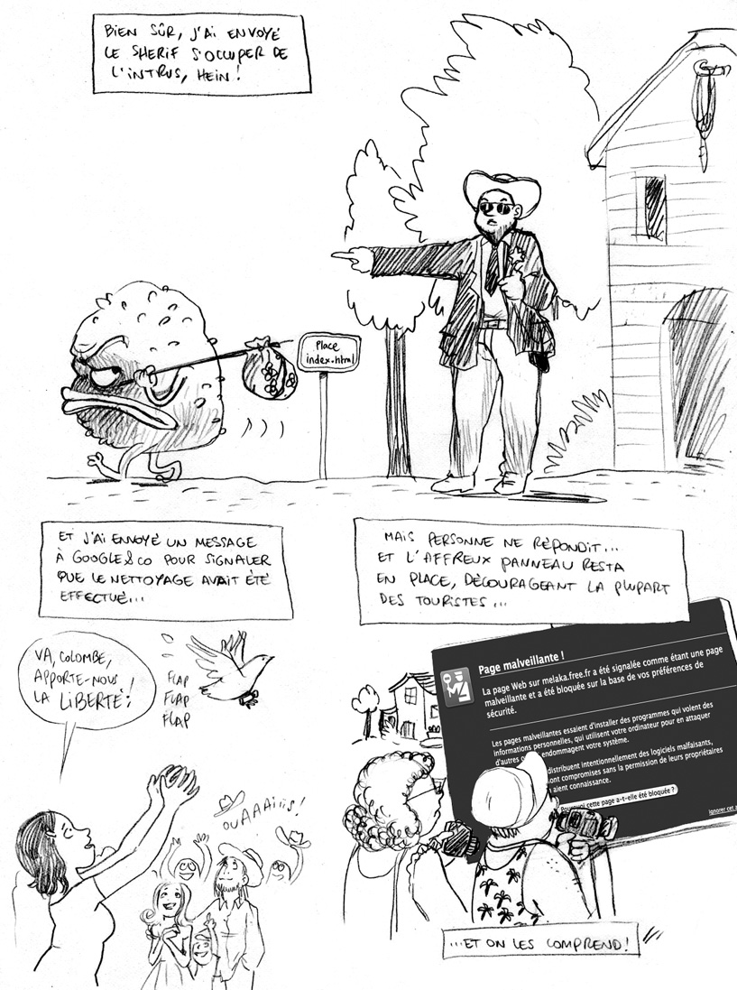 Pour ce qui est du site Free, je ne sais pas trop ce que tu peux faire. Peut-être inspecter soigneusement par FTP tous les fichiers que tu as sur le site, voir s’il n’y a pas de fichier que tu n’aurais pas mis toi-même (genre un fichier .exe). De nos jour, même un simple fichier Jpeg peut être dangereux sur un navigateur pas à jour, hélas. Ce genre de menace peut être dure à éradiquer.