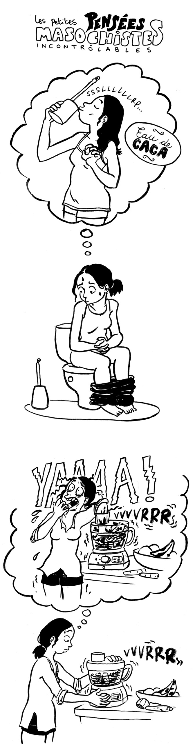 Oui, je voulais en dessiner beaucoup d’autres à la base… mais j’ai eu la flemme ! Je voulais faire le suçottage de la poignée de porte des toilettes d’un bistrot miteux, le coup de volant sur l’autoroute (mais là, j’aurai dû dessiner des voitures et des perspectives à la règle, irk !!), le lechouillage de barres de métro, enfin y a moyen d’en trouver un bon paquet uhuh