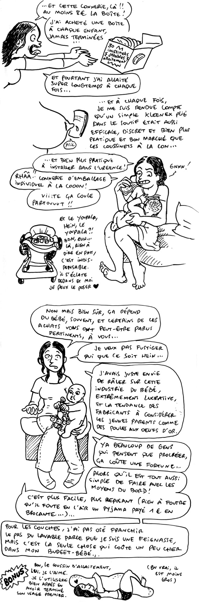 D’accord sur tout, sauf sur les coussinets d’allaitement : moi je n’en ai pas besoin non plus, mais ma femme oui ! Elle a commencé aussi avec des mouchoirs mais le papier est vite saturé et le lait perce les habits, tandis que le coussinet tient la journée.