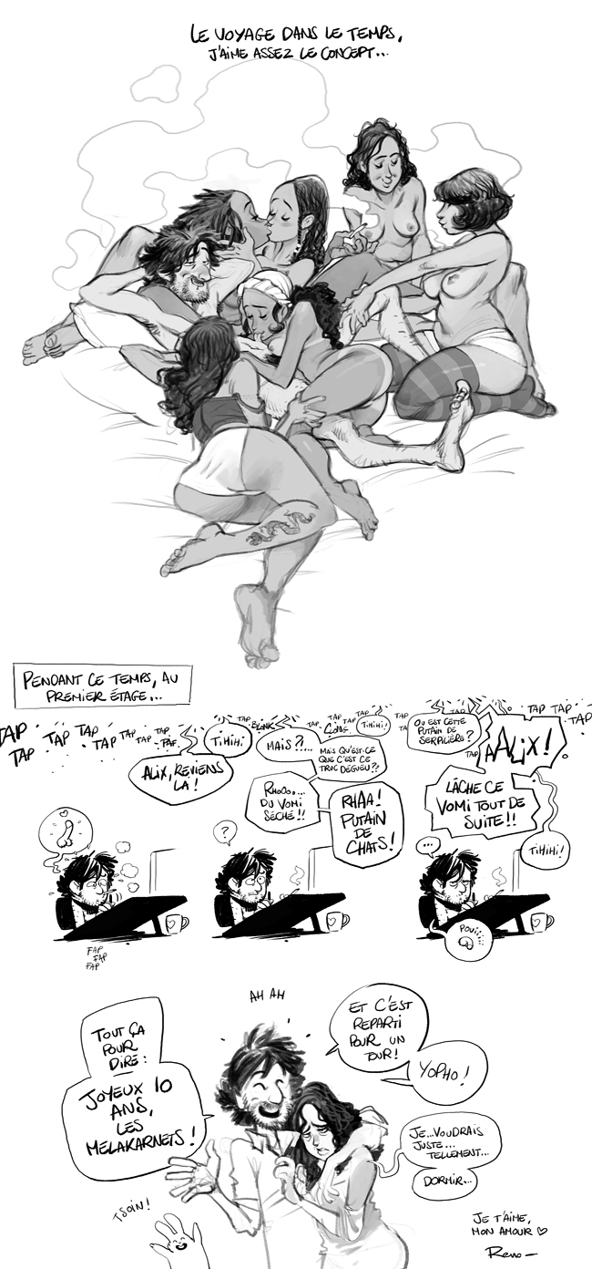 Et le dessin de Reno, là, oui oui, celui du milieu, il fait rêver. Ma compagne est aussi adorable que Mélaka, mais comme elle est plus v… je veux dire moins jeune, j’en aurais une demi-douzaine de plus. Miam.