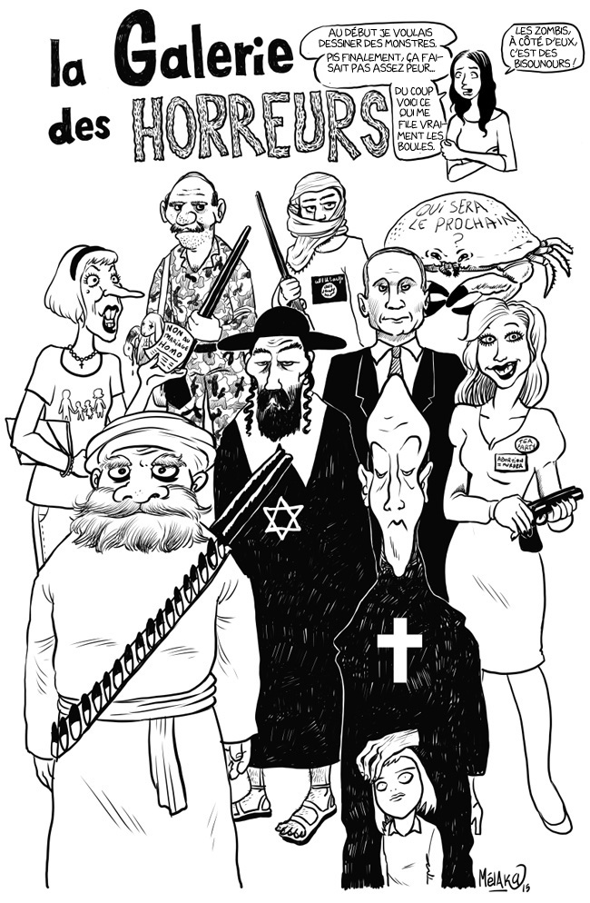 En fait, j’ai commencé le dessin en roue libre sans savoir du tout ce que j’allais faire, par le prêtre catho. Je n’avais pas encore bien determiné si j’allais dessiner des humains ou des monstres à ce moment là. Le reste a coulé de source… Après, on y voit ce qu’on veut 😀