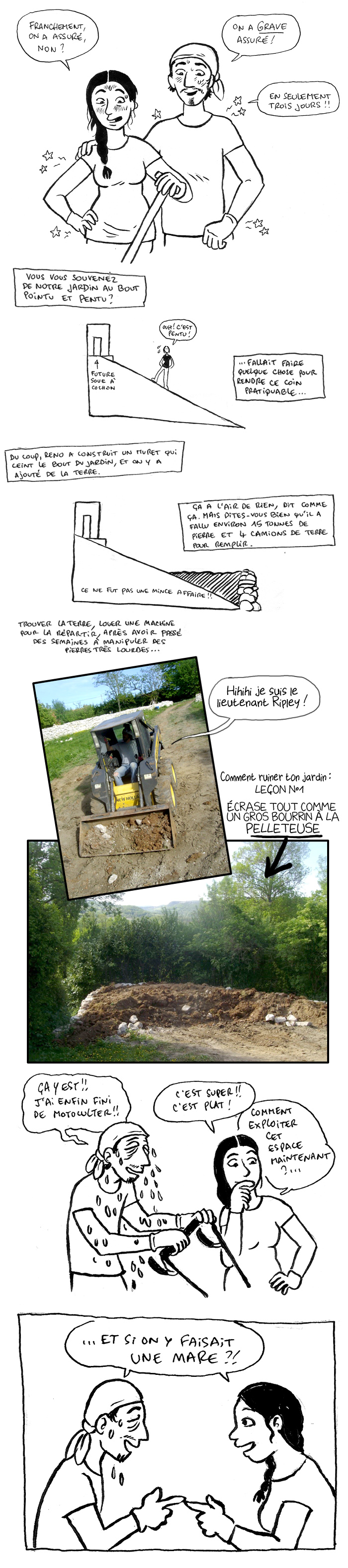 Je me préparais à m’extasier devant le travail réalisé (quand vous faites quelque chose, vous, c’est du travail de pro !), à vous féliciter d’avoir réhabilité le principe de la confection de « terrasses » dans les régions pentues, à compatir avec la fatigue et les courbatures (joliment rendues par les étoiles en plein de lieux de vos corps), etc. Il y aurait de nombreux commentaires admiratifs à exprimer.
